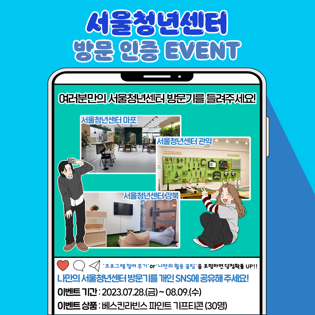 [BY 청년행복프로젝트] 서울청년센터 방문 인증 이벤트 2023.07.28.(금) ~ 08.04.(금)서울시 곳곳에 있는...